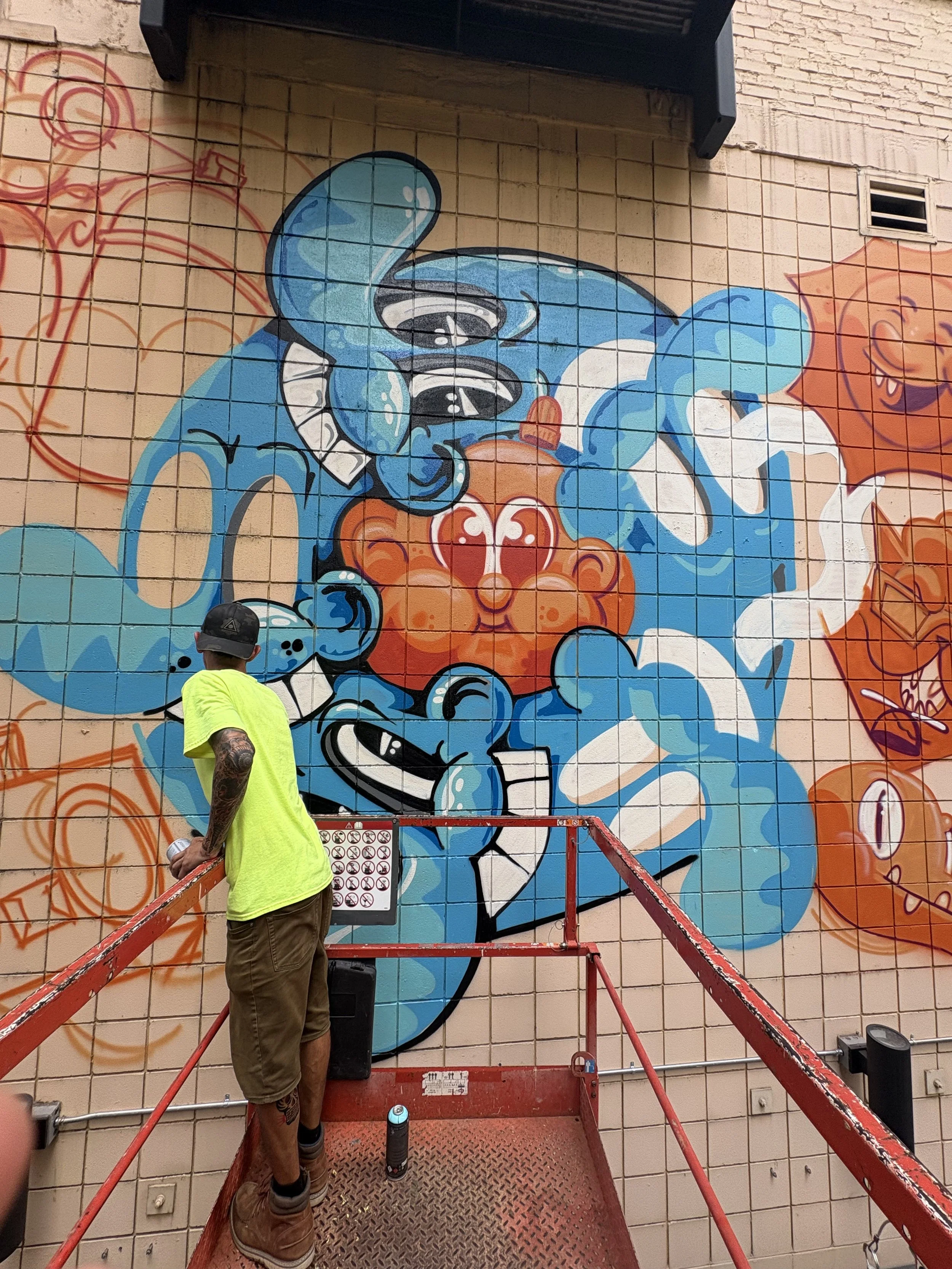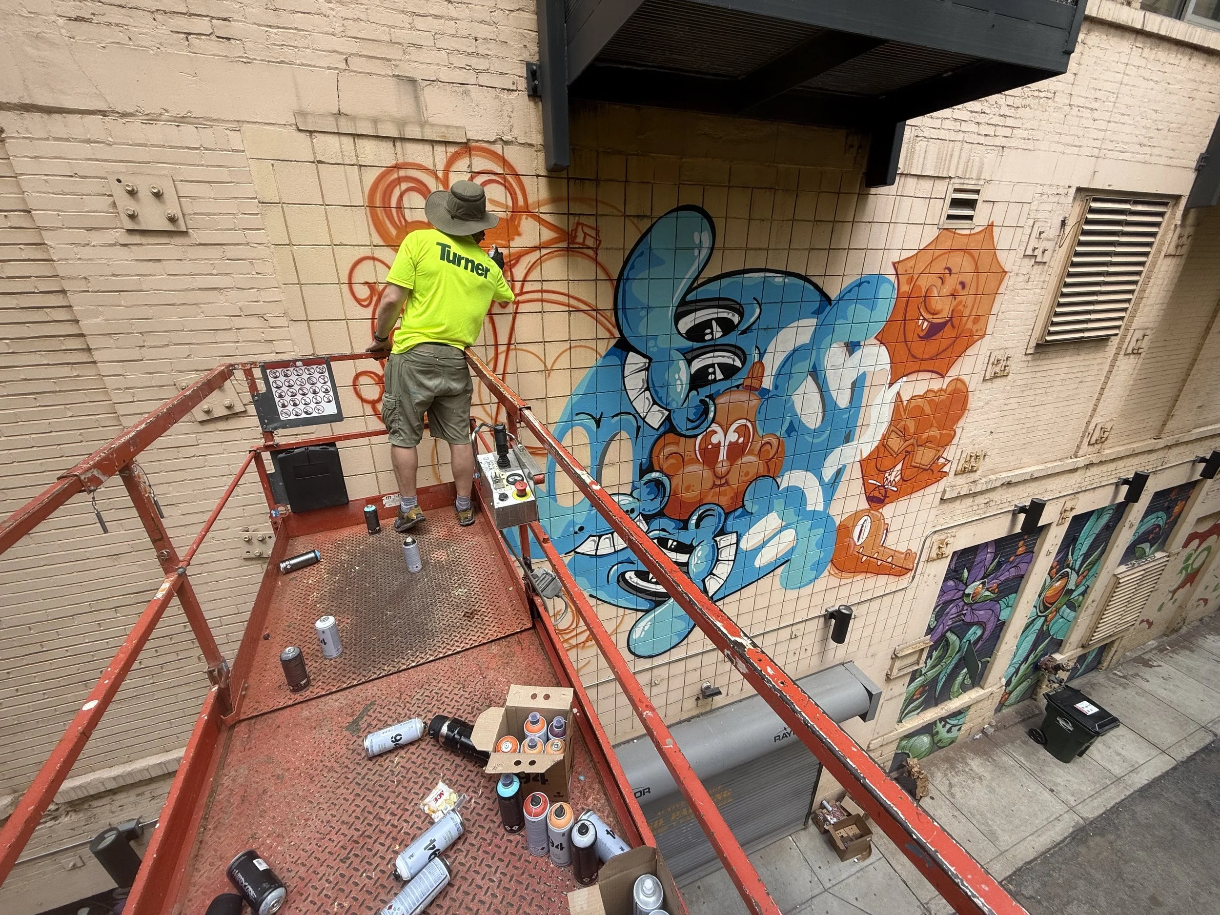 Instead of finding a small wall to play on, we went full public-facing and were invited to paint a piece on West Ogden Place opposite O’Malley’s in the alley.